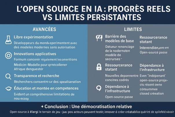 - Transparence accrue : La recherche progresse grâce à la possibilité d’auditer les modèles et de détecter les biais.